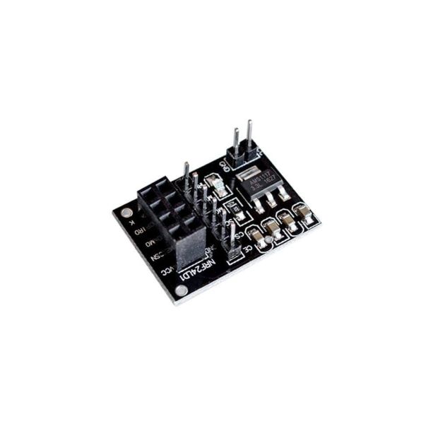 - This adapter plate board is designed to facilitate the easy integration of the 8-pin NRF24L01+ wireless transceiver module with microcontroller boards (such as Arduino, STM32, ESP8266, ESP32, etc.). It provides a stable 3.3V power supply with built-in voltage regulation and decoupling capacitors to ensure reliable operation of the NRF24L01+ module, which is sensitive to power fluctuations.